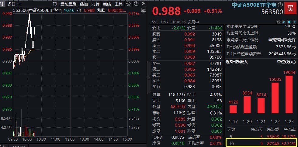 全市场唯一尾号500的中证A500ETF华宝(563500)小幅低开后快速拉升翻红,实时成交额超1亿元。近期资金加仓意愿浓厚,截至1月23日,该ETF近10个交易日累计申赎净流入超8.73亿元。