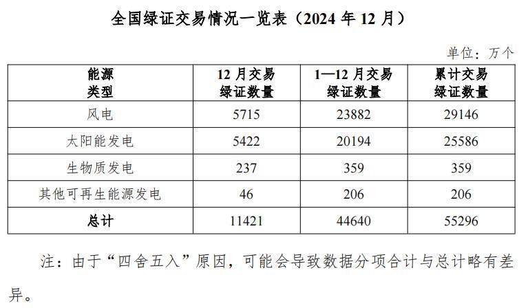 国家能源局发布2024年12月全国可再生能源绿色电力证书核发及交易数据